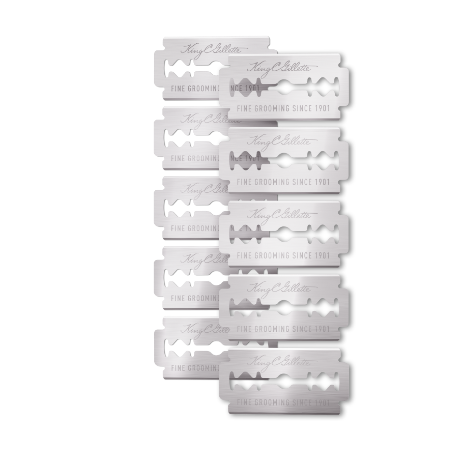 King C. Gillette Double-Edge Safety Razor refill blades are compatible with the King C. Gillette Double Edge Safety Razor and come in a pack of 10. These platinum-coated, stainless-steel blades have anti-friction coating to ensure a smooth, close shave or trim. With a blade like this, you can shape and edge your facial hair as you please without having to worry about skin irritation that could occur from shaving. But it doesn’t end there. The King C. Gillette Double-Edge Safety Razor refill blades are compatible with all beard types regardless of the length or shape. Using and replacing these anti-friction blades is easy. All you need to do is unscrew the handle, insert the blade, and reassemble. Repeat this with each new blade as often as necessary to get a smooth, clean cut, just as you want. The featured closed comb head design is there to bring you greater control of your grooming and your look. Usage is also very easy and with a blade at a 30° angle to the skin, you can achieve your desired look in just a few strokes. Walk out with a brand-new confidence that comes from trusting King C. Gillette who have dedicated years to ensuring that men’s grooming is not only easy but safe and enjoyable to do.