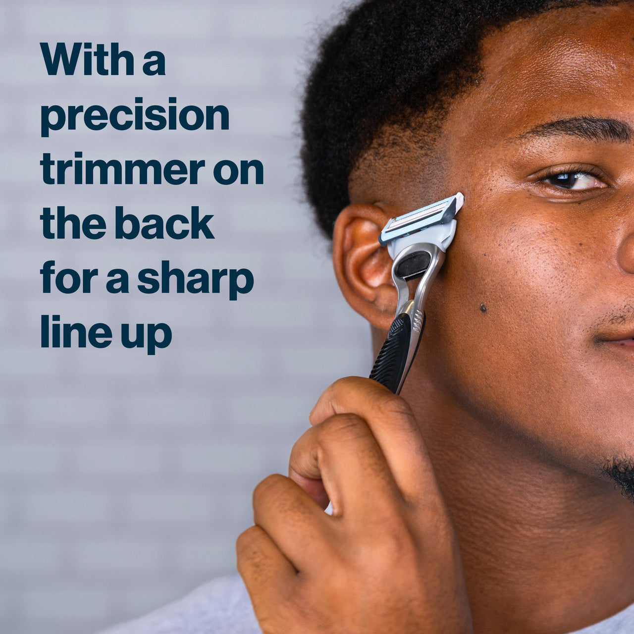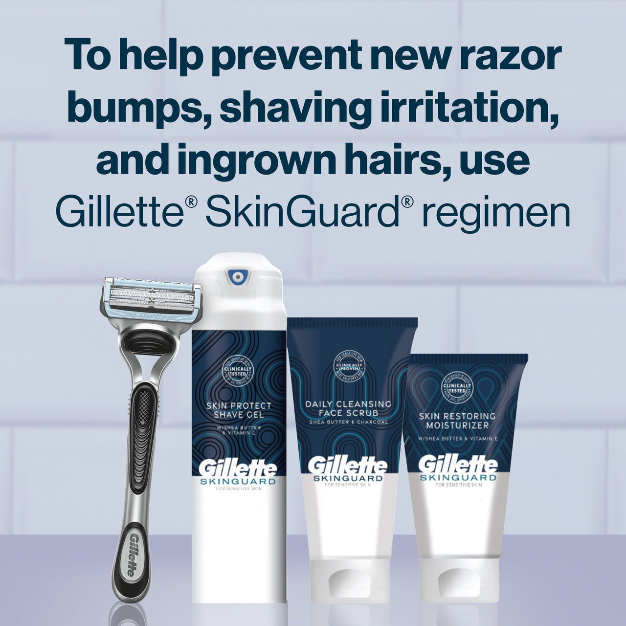 Gillette SkinGuard Razor is designed specifically for sensitive skin. The SkinGuard razor features two sharp, optimally-spaced blades to minimize tugging and pulling. Unlike most blades that cut hairs below the skin, SkinGuard's revolutionary “guard” technology gently positions the blades to cut hairs at skin level, helping to prevent new razor bumps and shaving irritation. This specialized technology is clinically proven for users with sensitive skin, providing a clean, comfortable shave. Gillette SkinGuard allows you to have the ideal blend of closeness and comfort while helping to protect against shave-related irritations. The lubrication, with a touch of aloe, is strategically placed both before and after the blades, delivering maximum comfort with each stroke. Crafted with a comfortable, form-fitting handle, this razor provides optimal control while shaving. Additionally, a precision blade on the razor's back allows you to perfect your lines and achieve a sharp, well-groomed look.